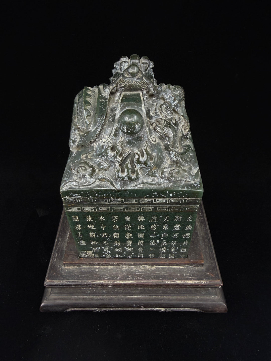 Large Chinese Carved Green Stone Dragon Seal / Chop Set with Matching Paste Box and Wood Stand