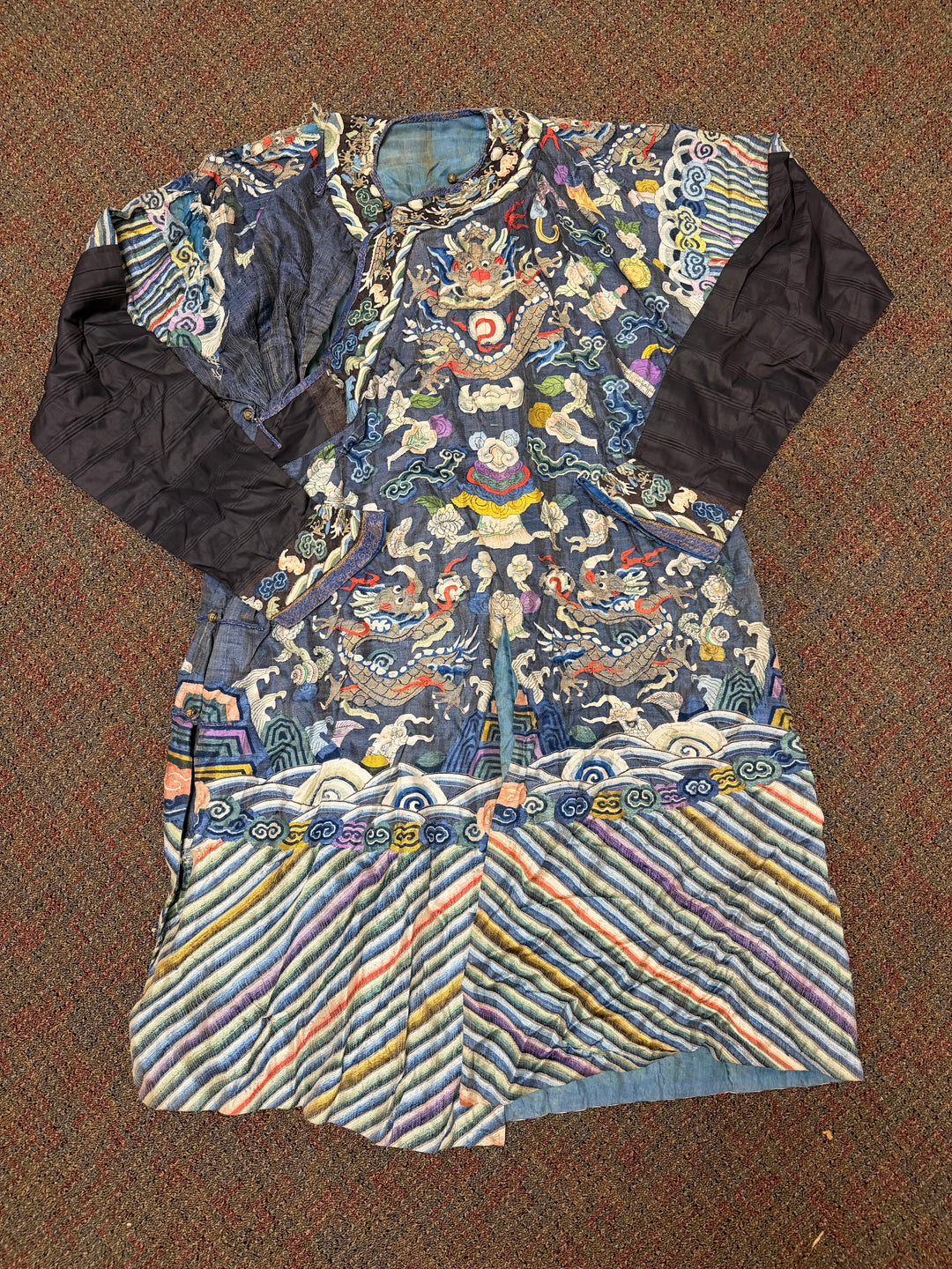 Vintage Late Qing/Republican Era Chinese Embroidered Blue Dragon Robe Jacket – Theatrical Opera Costume with Colorful Striped Wave Hem